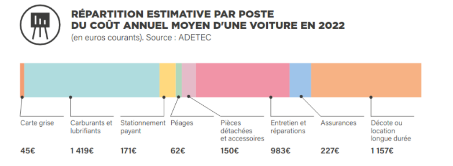 En 2022, l’Insee estime qu’en moyenne 11% du revenu des ménages est consacré au transport individuel. La même année, le Réseau action Climat a évalué le coût de possession et d’usage d’une voiture à 4210€.